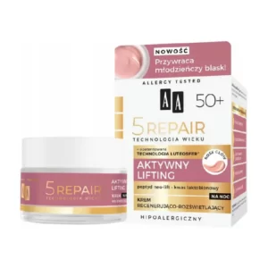Do najlepszych kremów do twarzy po 50 roku życia na stronie Natura-kosmetyki.pl dołącza AA Technologia Wieku 5Repair. Jest to zaawansowany dermokosmetyk stworzony z myślą o potrzebach skóry dojrzałej. Opatentowana technologia Luteosfer aktywuje pięciostopniowy proces rewitalizacji, stopniowo uwalniając składniki aktywne w głąb naskórka. Dzięki temu krem działa kompleksowo: liftinguje, wygładza, rozświetla i intensywnie nawilża cerę. Zawarty w formule kompleks Rose Glow z olejkiem różanym i rozświetlającymi pigmentami przywraca skórze młodzieńczy blask, a peptyd Neo-Lift poprawia napięcie i modeluje owal twarzy, dając efekt subtelnego liftingu. Dodatkowo olej z wiesiołka uelastycznia i odżywia cerę, a L-arginina wzmacnia jej nawilżenie, sprawiając, że staje się miękka i promienna. Hipoalergiczna formuła sprawia, że krem doskonale nadaje się również do skóry wrażliwej.